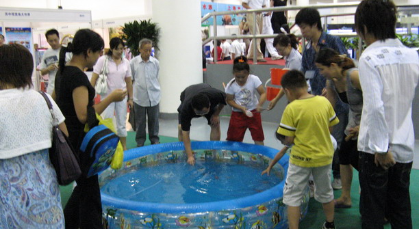 在现场,有上百家国内外从事休闲渔业的知名企业展现了自己的魅力。展会除了展出各类观赏鱼、爬行及两栖宠物、虾蟹等水族生物,将举行观赏鱼选美大赛、专家科普讲座、亲子垂钓等系列互动活动,头天的展会就吸引了数万业内专家和申城市民观展。