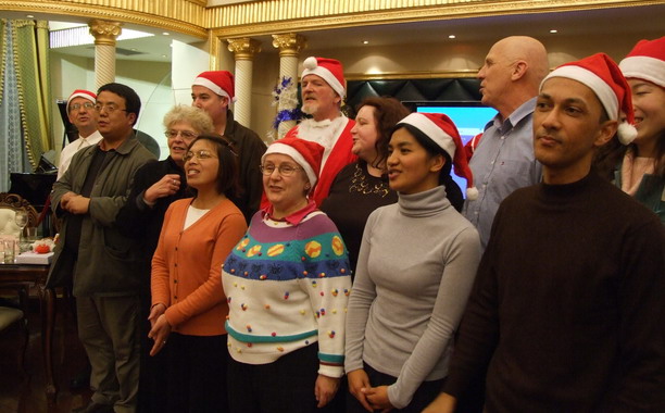 晚会上,中外方教师相互举杯祝福,畅谈工作和未来,大家一边唱歌,一边跳舞,一边做游戏,完全陶醉在节日的气氛中,当晚会进行到中场时,突然有一位身着红衣、头带红帽、长着白须的圣诞老人缓缓走进大厅,边走边向大家喊:“Merry Christmas!”,他来给大家送圣诞礼物了,每发一次礼物他都要说一次“Merry Christmas”、合一次影,俨然就是Santa Clause来到人间,大家仔细辨别才知道,原来这位韵味十足的圣诞老人就是来自美国的外教Michael。