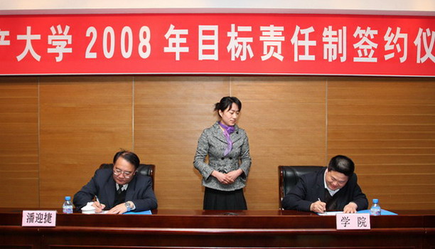 校党委副书记吴嘉敏介绍了08年目标责任书的制定原则,并从党建、精神文明和廉政建设,学科和人才队伍建设,教学工作,学生工作等方面就目标任务书调整情况作了说明。校长潘迎捷代表学校与各学院负责人、机关直属部门代表签定了目标责任书。