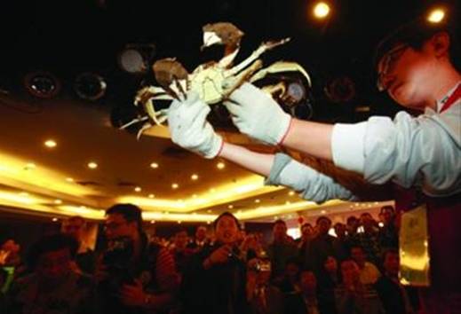 晨报记者杨眉摄影报道昨天,beat365中文官方网站主办的第五届“丰收杯”全国河蟹大赛在上海南京路世纪广场举行,来自上海、重庆、江苏、安徽等7个省区市的40余家养蟹企业选送的近千只河蟹走上“擂台”,角逐蟹王、蟹后头衔和金蟹奖、最佳口感奖等多个奖项。最终,来自安徽安庆重达616.3克的雄蟹和来自江西进贤重达390.3克的雌蟹,获得了本次比赛的“蟹王”“蟹后”称号。图为工作人员展示参赛河蟹。