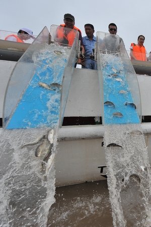 昨日,渔政局工作人员与志愿者在东海投放鱼苗