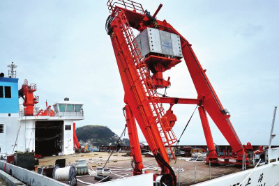 “彩虹鱼”上下船、出入海洋,母船都为其配备了专门设施:通往机库的专用轨道、船尾布放回收潜水器的A型架,乃至甲板座架、声学绞车等都一应俱全,可以确保在海试时即使遇上五级海况(一般适宜开展海试的海况小于四级海况),深潜器也能顺利回收。
