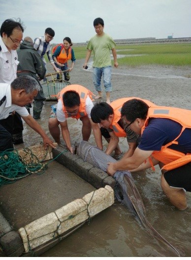 (By Yang Meiping) A sturgeon was found stranded in the tidal flat in Lingang Area by teachers and students from the Shanghai Ocean University on Thursday morning when they were surveying and mapping there.