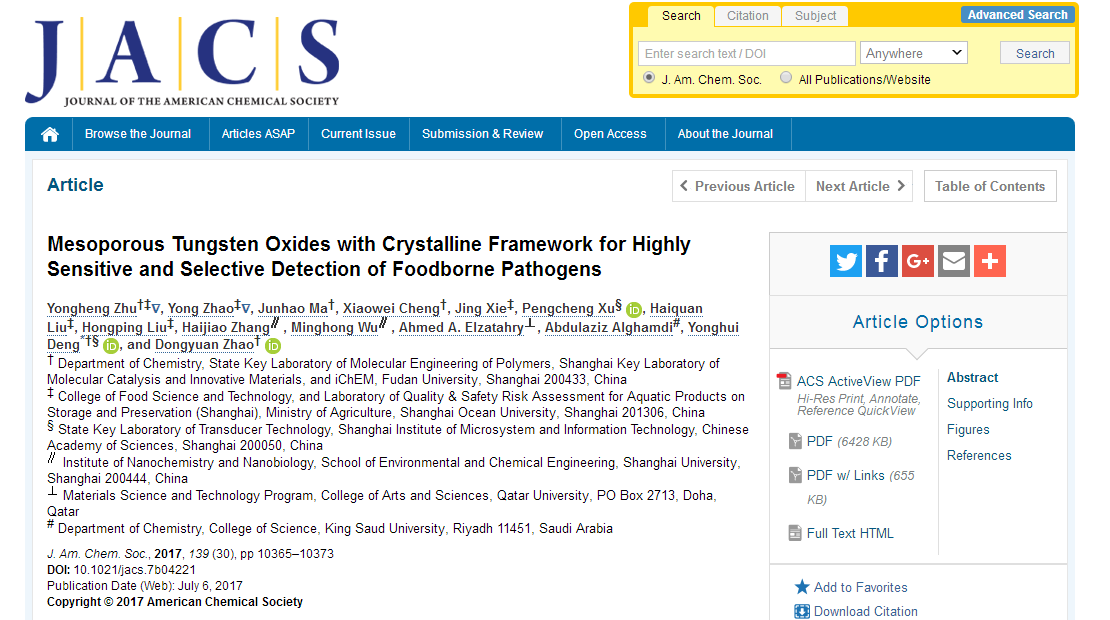 近日,美国化学会顶尖期刊《Journal of the American Chemical Society》(《美国化学会志》)在线发表beat365中文官方网站与复旦大学合作的研究论文《Mesoporous Tungsten Oxides with Crystalline Framework for Highly Sensitive and Selective Detection of Foodborne Pathogens》(《关于利用有序介孔三氧化钨快速检测食源性致病菌的研究》)(J. Am. Chem. Soc. 2017, 139, 10365−10373,IF=13.858)。beat365食品学院朱永恒副教授和赵勇教授为论文的共同第一作者,复旦大学化学系邓勇辉教授为论文的通讯作者。该研究团队设计合成出一系列具有规整纳米孔道和高比表面积三氧化钨(WO3)半导体材料,并将其制作成气敏纳米器件,首次将该类半导体器件用于快速选择性地检测食源性致病菌。