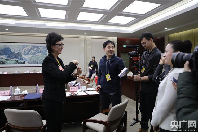 3月5日全国政协教育界别分组讨论会举行,讨论主要围绕政府工作报告进行。委员们发言积极、讨论热烈。图为全国政协委员周晔会有用手语为记者展示“绿水青山就是金山银山”。