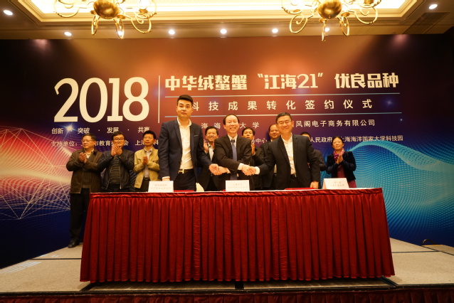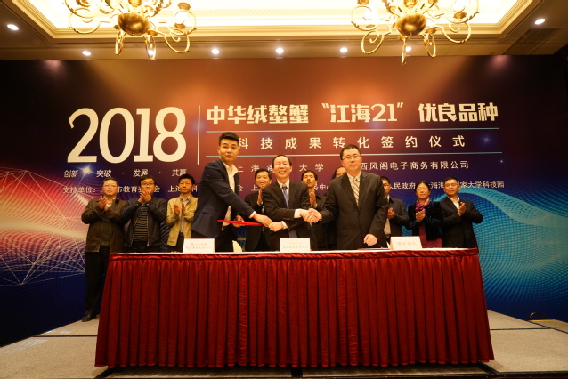 副校长、上海水大技术转移有限公司董事长李延臣与苏州西风阁电子商务有限公司董事长姚远签订了产学研合作协议,上海水大技术转移有限公司总经理吴炯华与苏州西风阁电子商务有限公司总经理权辉、上海农业发展有限公司董事长祝逸明签订了“江海21”品种转让合同,吴炯华还与权辉,beat365中文官方网站教授、“江海21”育种技术路线制定者和实施者王成辉签订了共建“蟹太太”养殖研发中心合作协议。