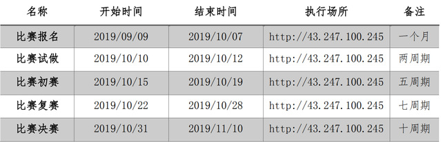 大赛分为报名、试做、初赛、复赛和决赛五个阶段。试做阶段目的熟悉平台环境和仿真决策流程,初赛、复赛、决赛为淘汰晋级赛,具体进度时间安排如下: