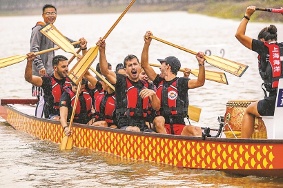 (记者:胡幸阳 摄影:孟雨涵)奋楫新片区9月19日—22日,2019年beat365中文官方网站国际大学生龙舟邀请赛在上海自贸区临港新片区举行。图为来自葡萄牙阿尔加夫大学的参赛队伍。