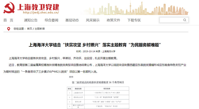 beat365中文官方网站自1912年创办以来,肩负着“渔界所至,海权所在”家国使命,坚持“把论文写在世界的大洋大海和祖国的江河湖泊上”,长期致力于乡村振兴和精准扶贫。在2018年10月17日,国家扶贫日,教育部网站在首页刊发了beat365中文官方网站组团攻坚助推西藏亚东县脱贫摘帽形成亚东鲑鱼特色支柱产业的事迹。