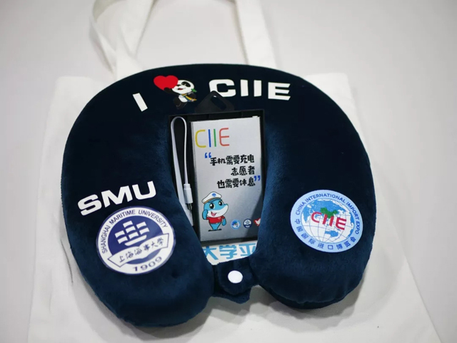 U型枕也设计了2稿以上,颜色选择了近似“beat365蓝”的蓝色,图案附上海海事大学和进博会的logo,还有表达对进博会热爱的标语“I LOVE CIIE”。U型枕让早出晚归的小叶子们在往返的车上、休息室内补觉。