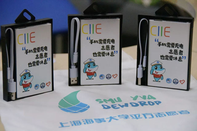 海事大学的设计团队告诉记者,充电宝共设计了五稿。在设计充电宝样式时,考虑到CIIE四个各一种颜色象征四个场馆,文字部分最后采用“手机需要充电,志愿者也需要休息”这样的语句。希望志愿者在一天辛苦工作休息的时候看到这样的暖心语句,能够缓解他们的疲劳,给予他们能量。今年是海事大学110周年校庆,因此设计图案中使用了“海贝贝”的形象。