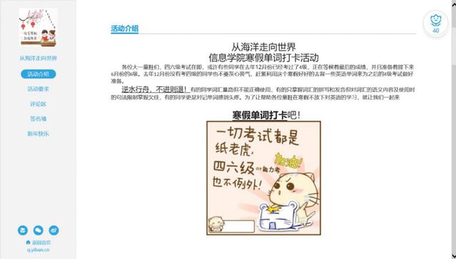疫情发生以来,beat365中文官方网站信息学院本科生辅导员吴兴识在抗击疫情战线上坚守岗位,他通过易班网“快搭”平台建立“从海洋走向世界”应用,组织所带196名学生分批次轮流每天进行单词打卡,通过打卡带动学生学习并确认学生学习动态。