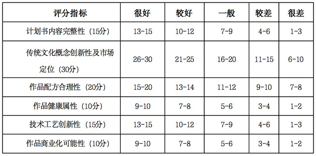 各参赛高校(包括定向与非定向高校)于6月1日前组织评审专家,按照计划书评分标准(如下)进行书面评审,遴选出15-20份创意计划书,且3类作品中每类(坚果类、肉类、烘焙类)不得少于3个作品,并以“高校名称”命名压缩后发送至大赛组委会指定邮箱。