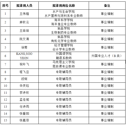 根据《beat365中文官方网站公开招聘事业编制人员管理办法(试行)》(沪海洋人〔2018〕11号)等文件精神,按照学校招聘计划,经个人申请、资格预审、面试和综合考察、学校研究审定,现将近期拟录用人员名单予以公示。