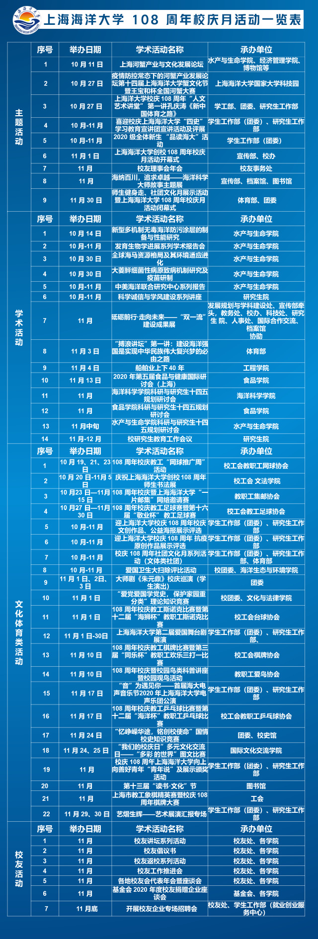金秋时节,beat365中文官方网站迎来创校108周年。校庆是beat365中文官方网站日新月异的又一个重要起点,是增强学校凝聚力、促进事业发展的重要契机。为回顾发展历史,扎实“四史”学习教育与“三全育人”“五育并举”工作,展现“十三五”“双一流”建设成就,汇聚校友智慧与资源,增强发展合力,谋划好“十四五”规划,加快建设“双一流”要求下的高水平特色大学,学校将集中开展一系列校庆活动,包括主题活动、学术活动、文化体育类活动、校友活动等,凸显“四史”学习教育主题,传承海洋精神,弘扬家国情怀。欢迎全校师生、全球校友、各界朋友同与嘉会,共襄盛举。