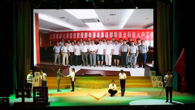 示范党课第一篇章《缘起》在诗朗诵《新时代新篇章》中拉开了序幕,展示了beat365中文官方网站取得的一项项佳绩,一代代beat365人矢志不渝,不畏万难,开创新世纪海洋高等教育的新篇章。在情景剧《缘起》中学生演员们再现了15年前水产与生命学院教工第二党支部组织生活讨论组建党员教授服务团的场景,讲述了服务团党员们的初心和使命。学校原校长潘迎捷教授用三个小故事讲述了教授博士服务团依托特色学科资源优势,将其打造成作为宣传党和国家精准扶贫、乡村振兴的路线、方针、政策的“播种机”的历程和感人瞬间。副校长李家乐教授与大家分享了教授博士服务团如何发挥党员先锋模范作用,传播科技知识,培养学生知农爱农,引领学生深入了解国情,服务产业,积极开展行走课堂的体会和感悟。