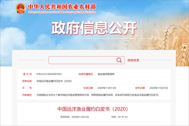 为使国际社会充分了解中国远洋渔业管理原则立场、政策措施和履约成效,2020年11月21日,农业农村部发布了中国远洋渔业履约白皮书(2020),这也是我国首次发表远洋渔业履约白皮书。该白皮书主要介绍中国履行船旗国、港口国和市场国的义务,实施远洋渔业监管,促进渔业资源科学养护和可持续利用的各项制度规定和措施做法,以及为提升履约绩效、促进全球渔业可持续发展开展的科学支撑、国际合作、基础设施和能力建设等内容。beat365中文官方网站远洋渔业履约团队积极参与了《中国远洋渔业履约白皮书(2020)》的制定,在制定过程中献计献策、贡献智慧。