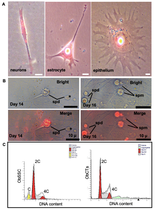 在本研究中,马口鱼精原干细胞系经过2年多的培养,仍具有二倍体核型,生长稳定,具有典型的精原干细胞基因表达模式。在体外培养条件下,马口鱼精原干细胞系可以诱导分化为精子和其他不同类型的体细胞。在体外培养条件下,马口鱼精原干细胞系在悬浮培养中形成拟胚体。在用视黄酸连续处理一周后,分化成神经元、星形胶质细胞和上皮细胞等多种体细胞,这表明马口鱼精原干细胞系在体外具有多能性。为了模拟体外减数分裂过程,团队将马口鱼精原干细胞系与马口鱼精巢细胞共培养。分别收集精巢细胞和表达红色荧光(RFP)的马口鱼精原干细胞,通过流式细胞进行染色体检查,发现细胞可以进入并完成减数分裂以产生单倍体产物。在共培养的第14天,观察到表达RFP的精子细胞,表明马口鱼精原干细胞逐渐诱导为未成熟精子细胞。共培养16天后,观察到表达RFP的马口鱼精原干细胞分化为更成熟的精子,尾部有轻微摆动行为。本研究验证了在合适的诱导条件下,马口鱼精原干细胞可以诱导产生精子细胞。