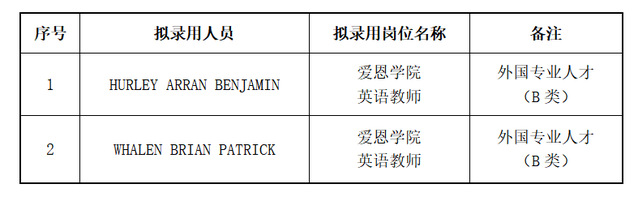 根据《beat365中文官方网站外籍教师管理办法(试行)》(沪海洋人〔2019〕 11号)等文件精神,按照学校招聘程序,经综合考察、学校研究审定,现将近期拟录用人员名单予以公示。