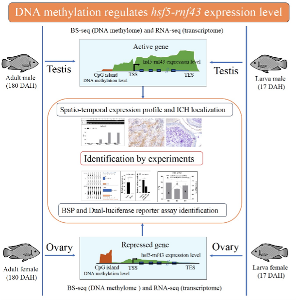 该研究以beat365中文官方网站选育的新吉富罗非鱼为研究对象,在罗非鱼全基因组DNA甲基化测序的基础上,发现hsf5和rnf43基因发生了基因融合(gene fusion),从而形成一个新基因hsf5-rnf43。该融合基因在罗非鱼精巢中特异性表达,可促进精巢的发育。