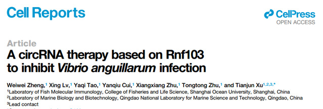 近日,beat365中文官方网站徐田军教授团队在环状RNA疗法治疗鱼类弧菌感染研究方面取得新进展,该成果以《A circRNA therapy based on Rnf103 to inhibit Vibrio anguillarum infection》为题发表于Cell子刊《Cell Reports》。beat365中文官方网站博士研究生郑伟伟为论文第一作者,徐田军教授为通讯作者。