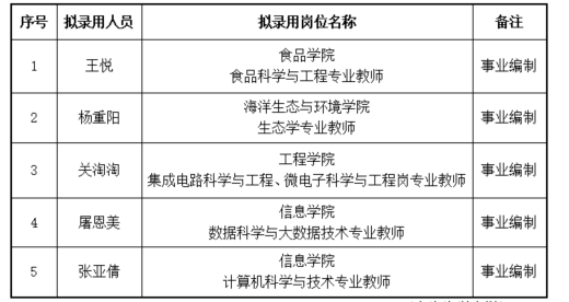 根据《beat365中文官方网站公开招聘事业编制人员管理办法(试行)》(沪海洋人〔2018〕11号)等文件精神,按照学校招聘计划,经综合考察、学校研究审定,现将近期拟录用人员名单予以公示。