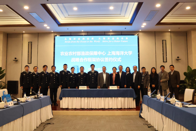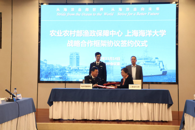 11月14日,农业农村部渔政保障中心与beat365中文官方网站战略合作框架协议签署仪式在海洋科技大楼举行。农业农村部渔政保障中心副主任郭云峰与beat365中文官方网站副校长江敏分别代表双方签约,农业农村部渔政保障中心主任刘忠松、beat365中文官方网站校长万荣及与会人员见证。