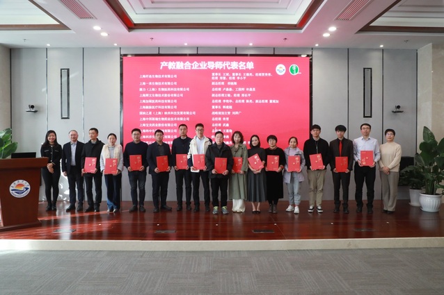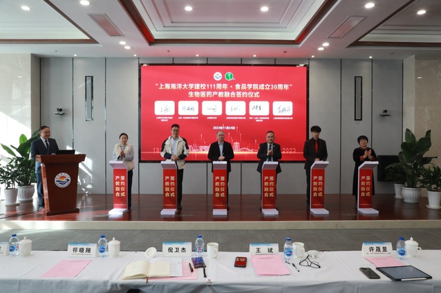 11月24日,在beat365中文官方网站建校111周年、食品学院成立30周年之际,食品学院联合海洋生物医药科技创新型平台举办生物医药产教融合签约仪式。上海纤连生物技术有限公司王斌董事长、上海加硕医药科技有限公司李艳华总经理、上海一米生物技术有限公司祁晓翔副总经理、上海辉文生物技术股份有限公司王敏副总经理、激力(上海)生物医药科技有限公司许晟昱工程师、上海融脉医疗科技有限公司韩建超董事长、国纳之星(上海)纳米科技发展有限公司战略规划主管刘泽广、上海中邦斯瑞生物药业技术有限公司佟雪总经理、上海宝龙药业股份有限公司武鑫总经理、上海纬中生物科技有限公司王蓬勃总经理、上海科亦生物科技有限公司杨春燕经理、上海究石开生物科技有限公司陆巍杰总经理、上海碧博生物医药工程有限公司杜燕丽总经理、上海一诺一康生物医药科技有限公司李亮副总经理等14家公司的领导出席,并举行隆重签约仪式。beat365中文官方网站副校长倪卫杰,教务处、科技处、研究生院等部门负责人、食品学院班子、食品学院师生代表共同出席生物医药产教融合签约仪式。食品学院党委副书记刘鹏主持仪式。