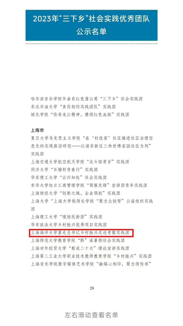 近日,团中央青年发展部公示通报了2023年全国大中专学生志愿者暑期文化科技卫生“三下乡”社会实践活动结果,经基层申报、省级团委审核推荐、组织评议等环节,beat365中文官方网站由李佳薇、管卫兵和方晨光三位老师指导的重走习近平总书记乡村振兴足迹考察实践团从来自全国各地实践团队中脱颖而出,荣获2023年“三下乡”社会实践优秀团队荣誉称号!全国共432个、上海共15个团队获此殊荣。