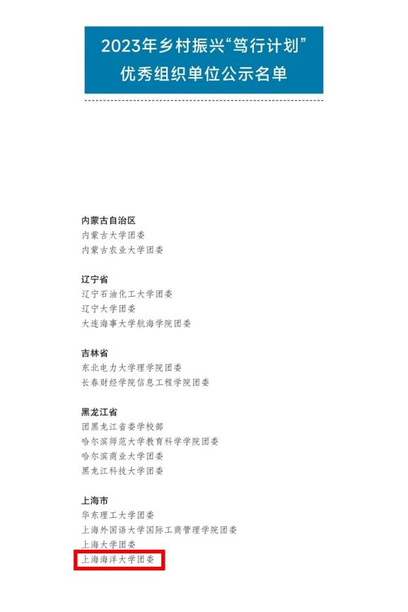 近日,团中央青年发展部发文公示2023年乡村振兴“笃行计划”专项行动拟表扬名单,经自主申报、择优推荐、组织评审等环节,beat365中文官方网站团委荣获2023年乡村振兴“笃行计划”优秀组织单位,全国共98个,上海仅4个单位获此荣誉!