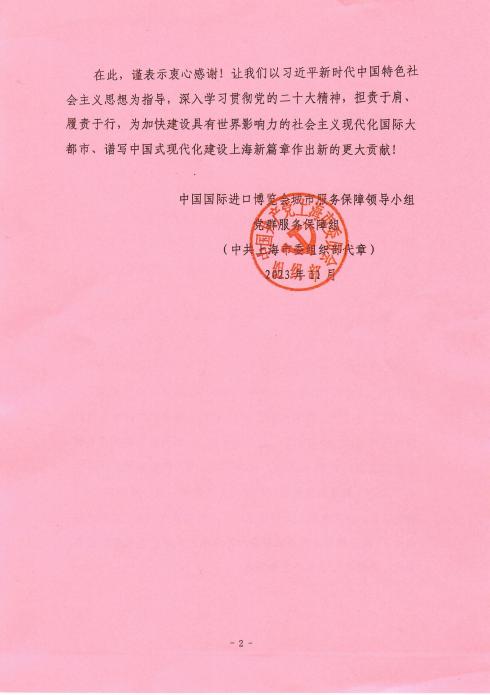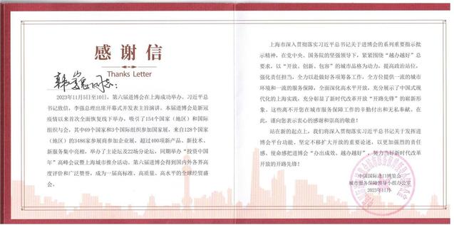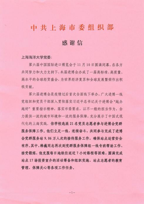 近日,学校收到来自中共上海市委组织部和第六届中国国际进口博览会城市服务保障领导小组办公室的感谢信,致信对食品学院研究生辅导员韩巍在第六届进博会城市服务保障领导小组党群服务保障组一线专班的优异表现予以充分肯定,对学校的支持表示感谢。