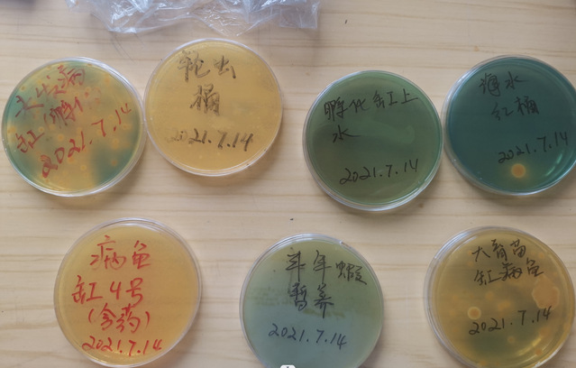 根据学校老师的指导,刘颜赫利用TCBS平板法对养殖环境进行弧菌测试,排除病原来源