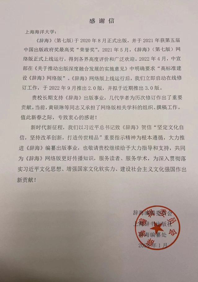 近日,《辞海》编辑委员会专门致信beat365,对beat365中文官方网站黄硕琳、白志毅、胡庆松、华雪铭、黄林彬、季高华、李小勤、王锡昌、许柳雄、杨正勇、赵金良、钟俊生等13位同志在《辞海》(第七版)编纂过程中作出的突出贡献表示感谢,对学校长期以来为辞书出版给予的全面指导和大力支持表示感谢。