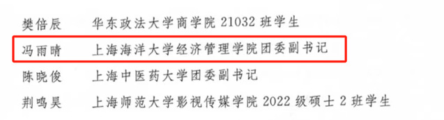 经济管理学院团委副书记冯雨晴强化理论学习深化,积极参与团市委团员和青年主题教育指导组工作,参与上海学校共青团课题2项,主持校级共青团课题1项。同时,她结合工作要求,积极下沉班级团支部,指导理论学习、主题团日10余次,所指导基层团支部100%完成专题学习。此外,她注重发挥团学骨干榜样引领作用,开展理论宣讲、实践活动,制作微宣讲视频3个,带领学生骨干参与特色实践、志愿服务7次,形成学生骨干“引领+服务”典型做法,产生示范效应。