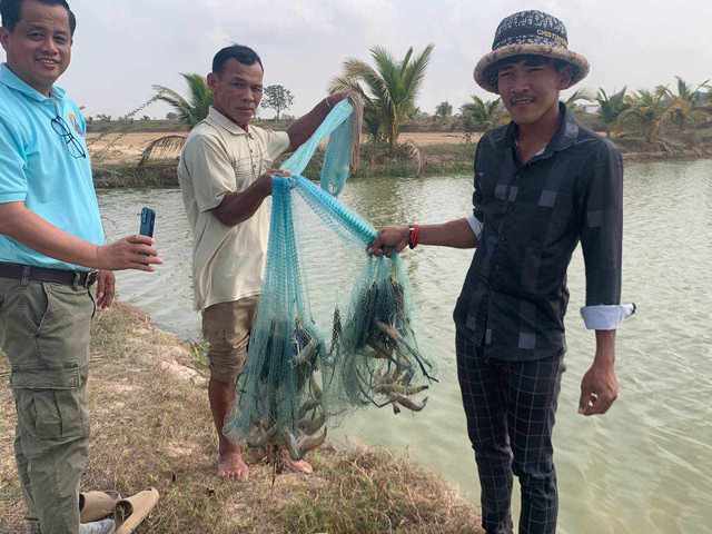 吴旭干教授通过手机指导柬埔寨Takeo省农户进行全雄罗氏沼虾苗种的中间培育
