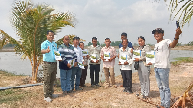 交流活动开始前,Thay Somony处长代表项目组给柬埔寨Takeo省当地稻虾示范户赠送了由项目组编写和制作的柬埔寨语版《稻渔种养技术手册》,该手册涵盖了稻渔种养的基本原理、通用技术、推广策略和典型模式,可以给柬埔寨基层农技人员、农民和青年学生提供技术参考。稻虾养殖户激动地接过这份技术手册,非常感谢柬埔寨农林渔业部、中国农业农村部和beat365中文官方网站对他们的帮助,他们对当地稻种养产业的发展充满了期望。