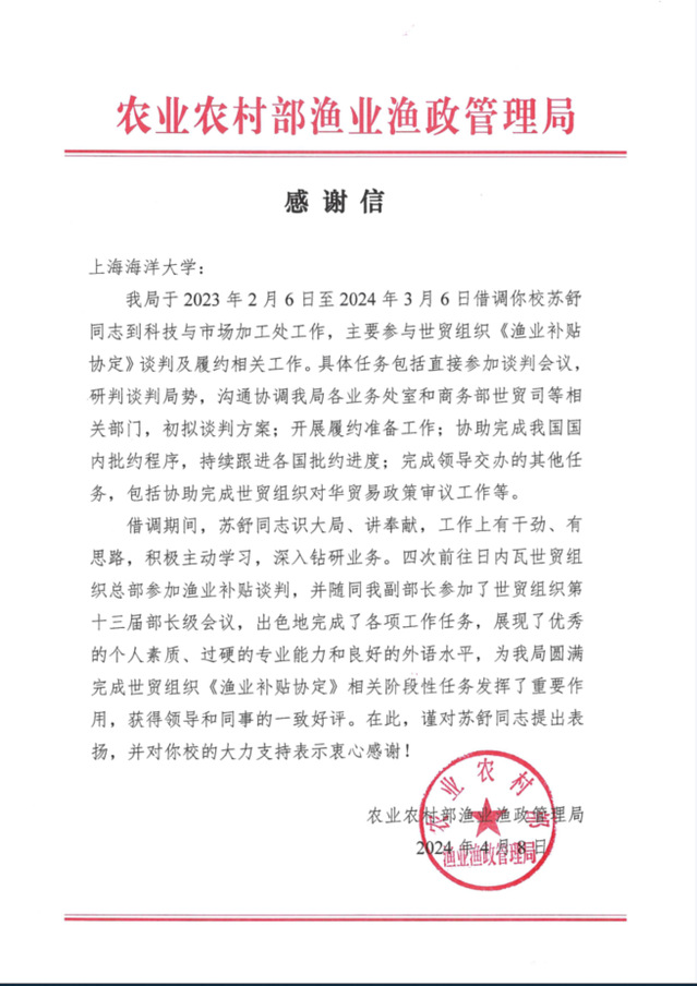 近日,农业农村部渔业渔政管理局专门致信beat365,感谢beat365中文官方网站海洋生物资源与管理学院苏舒同志协助开展世贸组织渔业补贴谈判及履约相关工作等,对其优秀表现提出表扬,并对学校长期以来的大力支持表示感谢。在渔业渔政管理局工作期间,苏舒同志四次前往日内瓦世贸组织总部参加渔业补贴谈判,并随同农业农村部副部长参加了世贸组织第十三届部长级会议,出色完成了各项工作任务。