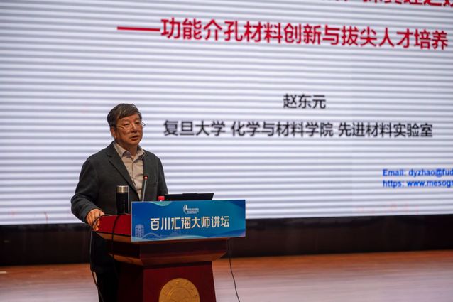 1998年,赵东元院士放弃了优渥的条件从海外归来,选择进入复旦大学化学系任教。谈到回国后面对的极为艰苦的科研条件,他没有任何抱怨,他说,这有什么好抱怨的,这是自己的祖国,还会抱怨自己家里穷吗。于是,他利用三万元的启动经费,带领着学生白手起家,自己搭建实验室,几乎每周的工作时间都超过八十个小时、连续十几个小时泡在实验室里。为了攻克创造有机的高分子材料这一难题,赵东元组建科研团队苦战多年,最终创造出有机的高分子材料。他鼓励同学们要有敢于争先的意志、不断上进的决心,在任何工作中都要奋勇争先,努力起到带头作用。他这次科研突破也是他们第一次创造了有机介入的概念,更是在有机-无机自组装的基础上首次提出有机-有机自组装的新方法。至今已经吸引60多个国家和地区的1500余家科研机构跟踪研究,利用相似的方法研究介孔高分子、碳材料等,发表论文数万多篇。国际学术界评价这项研究的贡献为“先驱”“里程碑”“突破”“重要进展”等。赵东元院士还鼓励同学们立志成才,把成才梦融于中国梦,在实践中国梦的历史进程中施展才华、奋发作为。