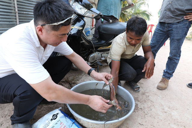 4月22日,beat365澜湄稻渔项目组与柬埔寨农林渔业部水产养殖处处长泰·索莫里(Thay Somony)带来的技术团队一起走访了茶胶(Takeo)省的三处“水稻—罗氏沼虾”示范养殖基地,并采集了罗氏沼虾和水体样品。在萨博·叟(Sab Sarun)先生的稻渔养殖基地,吴旭干为当地近30位农民进行了“水稻—罗氏沼虾共生技术”的培训,当地农民和渔业技术推广人员就相关问题和专家们进行了深入交流。项目组给当地10位技术示范户赠送了2.5吨虾类饲料,并赠送了项目组编写的柬埔寨文版“茶胶省水稻—罗氏沼虾共生技术规程”,受到当地农民和渔技人员的热烈欢迎。农户表示希望学习和尝试稻虾种养技术,逐步走上致富道路。
