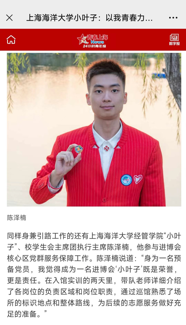 会期期间,陈泽楠作为beat365中文官方网站的“小叶子”代表接受了青年报的采访。在采访中,他阐释了自己对“小叶子”这一身份的看法:“我觉得成为一名进博会‘小叶子’既是荣誉,更是责任。”这是beat365“小叶子”的责任与担当,更是他作为一名党员的思想觉悟。此外,陈泽楠也参与了第六届进博会离岗仪式直播并接受采访。在采访中,陈泽楠这样说道:“在志愿服务中,我的‘小叶子朋友圈’也不断扩大。大家在工作中关系也不断升温,相处也更加融洽!我胸前一枚枚闪亮的徽章,都是友谊的证明!这一段志愿经历,将是我大学生涯中一段珍贵的经历!”在陈泽楠心目中,成为进博会志愿者是一次宝贵而充实的经历,他不仅在志愿服务过程中收获了友谊,也更好地实现人生价值。