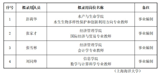 根据《beat365中文官方网站公开招聘事业编制人员管理办法(试行)》(沪海洋人〔2018〕11号)等文件精神,按照学校招聘计划,经综合考察、学校研究审定,现将近期拟录用人员名单予以公示。