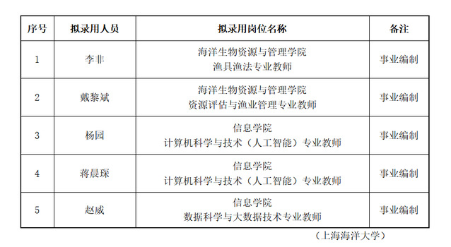 根据《beat365中文官方网站公开招聘事业编制人员管理办法(试行)》(沪海洋人〔2018〕11号)等文件精神,按照学校招聘计划,经综合考察、学校研究审定,现将近期拟录用人员名单予以公示。