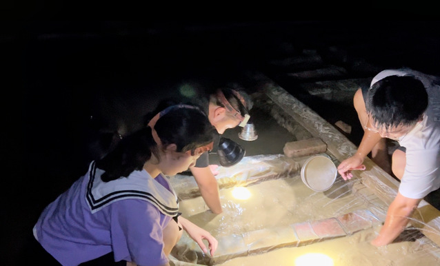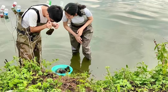 每天的日常工作中,抄池和疏通管道是必不可少的。抄池能让蚌苗均匀分布,避免密度过大导致的缺氧死亡,疏通管道则避免水管被淤泥堵塞,影响水循环。“还记得有次忙完准备离开育苗大棚时,迎面就撞见一只巨大的蜘蛛,我俩就开始尖叫。可师兄一把撩开蜘蛛,还戏称那是帮助他们捕捉蚊虫的好帮手。”李恺雯说,“这时回想起课堂上老师说的话,水产人扎根田间地头塘口,平时就要多锻炼自己,别怕吃苦,再后来我们碰到这些小虫,也慢慢适应了。”