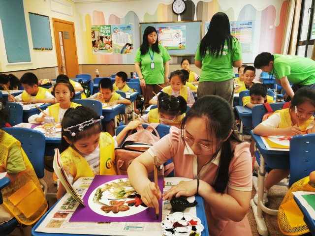 “我曾担任校金石书画社的骨干,已经累计组织了20场以上书画体验活动。这次,我也将有海洋特色的书画课程带进了社区暑托班”。7月8日,在卢湾二中心小学,beat365中文官方网站水产与生命学院的李俊逸为暑托班的小朋友带来了《书画版游记——从大宋汴京启航的丝绸之路》的课程。三十余名学生在课堂上轮番发言,气氛十分活跃。“我们希望小朋友通过这门课,了解宋朝造船技术、学习画水墨虾、体验云赶海,领略传统文化与现代艺术的完美结合。也很高兴地看到小朋友们下课举着画出门,迫不及待向家长展示。”