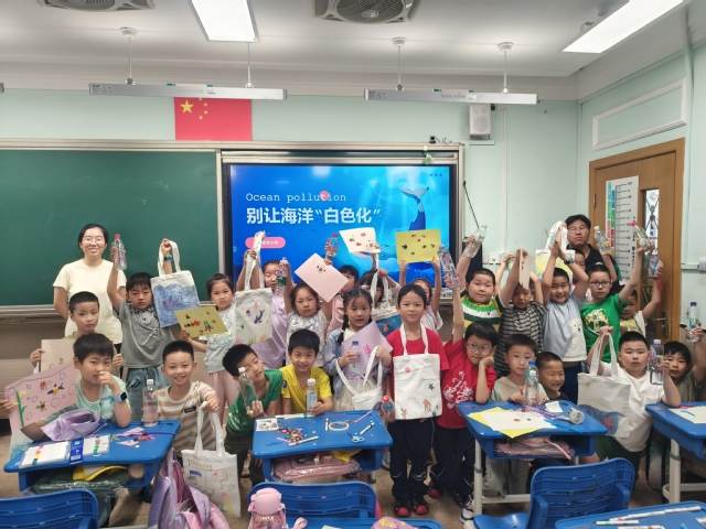 “塑料制品会给海洋动物和海洋带来什么影响呢?这是课程《别让海洋“白色化”》的负责人阎钰曼带领小朋友们探讨的问题。这节课先让小朋友了解什么是塑料垃圾以及塑料垃圾对海洋环境的影响,再着眼于如何减少塑料在生活中的使用,引导小朋友们集思广益,通过热烈的课堂讨论找到答案。课堂加入的动手环节,让大家亲笔绘制了海洋元素的帆布袋、用废弃塑料制品做成海洋小动物。创作环节精彩纷呈,课堂讨论意趣无穷,小朋友们收获满满。