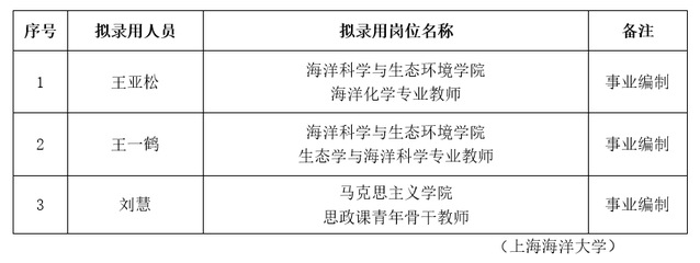 根据《beat365中文官方网站公开招聘事业编制人员管理办法(试行)》(沪海洋人〔2018〕11号)等文件精神,按照学校招聘计划,经综合考察、学校研究审定,现将近期拟录用人员名单予以公示。