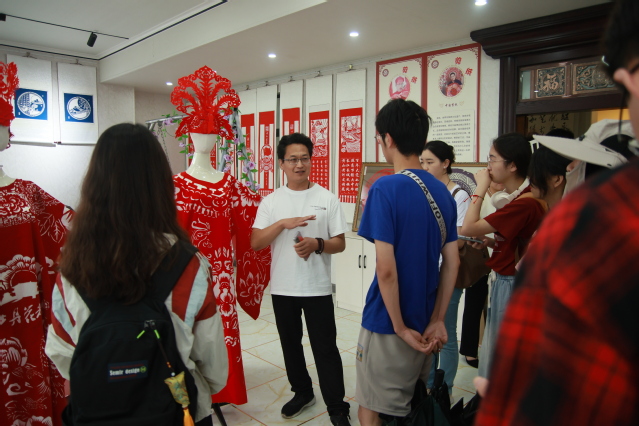 汝阳非遗剪纸传承人赵殿伟老师向beat365实践团成员讲解