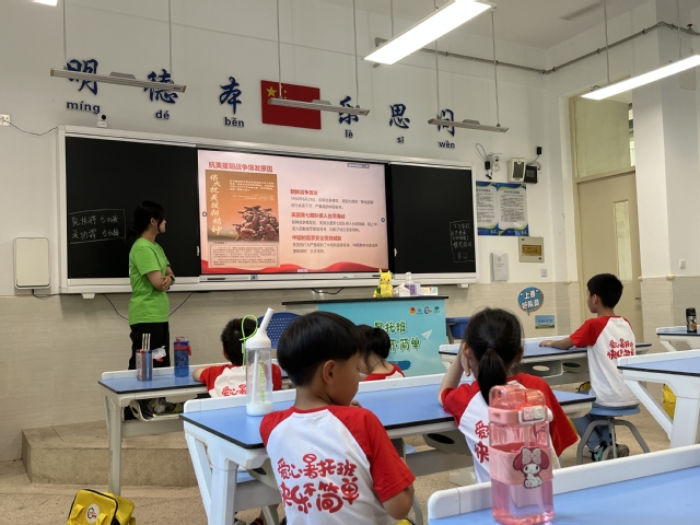“其实就是大手牵小手,让孩子们可以通过哥哥姐姐们的视角来看待、学习党的精神。”项目组成员王奕天作为上海市青浦区思源小学爱心暑托班志愿者的一员,面向“小娃娃”们围绕抗美援朝精神开展宣讲。除了介绍抗美援朝的相关背景和历史意义,她把重点放在了英雄故事和趣味互动上。“暑托班的孩子年纪都不大,你如果只有一个课件的话会非常枯燥。”王奕天这样总结自己的宣讲实践,“但是如果讲讲大家都看过的电影《长津湖》啊,把他们平时课堂内的诗词朗诵、英雄人物连连看什么的加进来,大家的注意力和兴趣点都会聚焦在宣讲上边。”满腔赤诚守山河、百万雄师过大江,保家卫国气昂昂的民族力量,就这样通过“寓教于乐”的生动叙述传递给大家。
