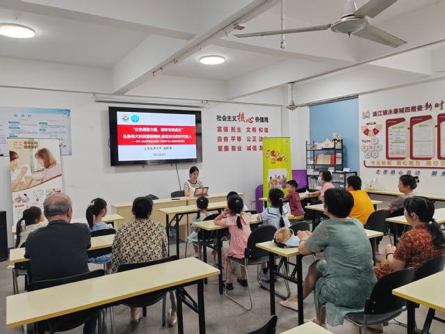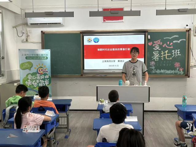 面对小学生,来自社会工作专业的黄诗云则选择充分发挥自身的学科优势。在上海市虹口区第一中心小学爱心暑托班,她以《做新时代社会服务的青春行者》为主题开展宣讲。从自己在社区实习的经历以及志愿服务经历出发,黄诗云谈论了自己对于如何做新时代社会服务青春行者的思考。通过解读脱继龙、黄文秀两位青年榜样的事迹,她让“娃娃们”生动形象地领略了她们的精神品格和动人风采。