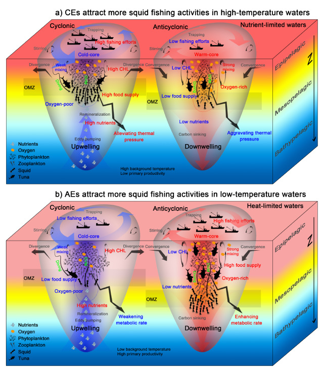 不同于高营养级捕食者(如金枪鱼),以鱿鱼为代表的中营养级生物既受到海洋环境驱动的下行控制,同时又受到捕食者驱动的上行控制,其背后的物理-生物相互作用机制更为复杂。聚焦中尺度涡对全球大洋鱿鱼渔场的影响,该研究应用基于卫星的高分辨率全球捕捞活动数据集,对全球大洋中主要的鱿鱼渔场进行了一系列的统计分析,发现中尺度涡对全球主要的大洋鱿鱼渔场捕捞活动产生了一种纬向反转的影响(图1),即热带(温带)水域的鱿鱼捕捞活动更倾向于聚集在气旋涡(反气旋涡)核心,并且这一影响模式会随着涡旋强度的增强而放大。结合过去中尺度涡对顶级捕食者影响的研究结果(Xing et al., 2023),该研究推测中尺度涡对鱿鱼捕捞活动的影响更多是由海洋环境驱动的下行控制所调节。该研究进一步结合卫星遥感观测的海表数据、ARGO/BGC-ARGO观测的深层海洋数据以及鱿鱼类物种显著的代谢热敏感性,提出了中尺度涡引起的环境变化可能会在鱿鱼食物摄入和能量消耗之间产生一种平衡,导致这些大洋鱿鱼在炎热但食物有限的水域中更喜欢较冷且富营养的气旋涡,而在营养丰富但热量有限的水域则更喜欢温暖且富氧的反气旋涡的科学假设(图2)。